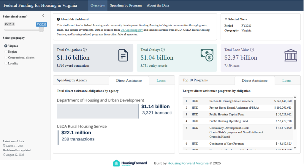 Federal Spending Dashboard: We launched an interactive tool tracking federal housing investments in Virginia—from HUD grants to USDA Rural Housing Service loans. Using data from USAspending.gov, the dashboard shows where federal dollars are flowing, which programs are most active, and how spending has changed over time.